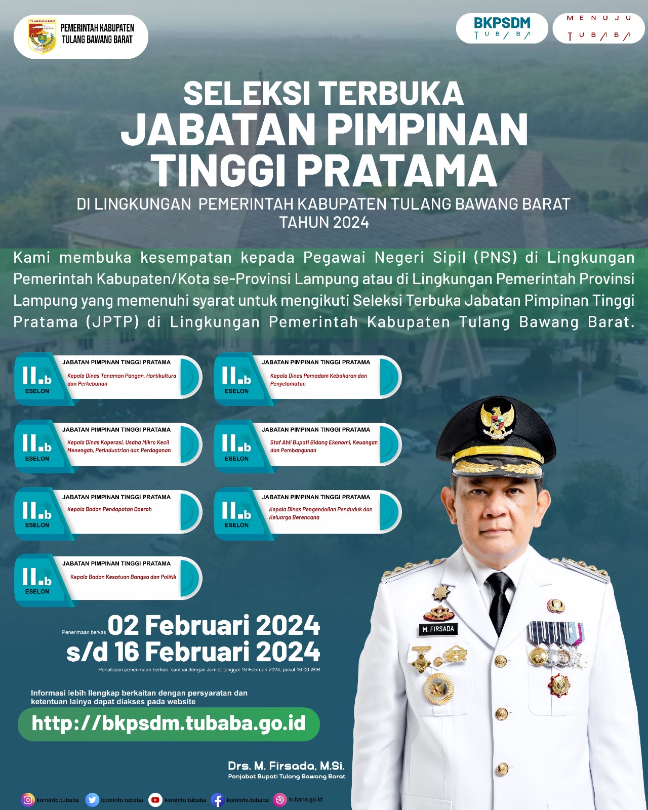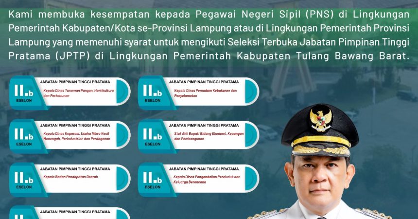 Tulang bawang barat,catatanlampung.com- Penjabat (Pj) Bupati Tulangbawang Barat (Tubaba) Drs. M. Firsada, M.Si. menyatakan Pemerintah Kabupaten (Pemkab) Tubaba telah membuka pengumuman seleksi terbuka pengisian 7 (tujuh) Kepala Organisasi Perangkat Daerah (OPD) atau Jabatan Pimpinan Tinggi Pratama (JPTP) yang dimulai 2-16 Februari 2024.
