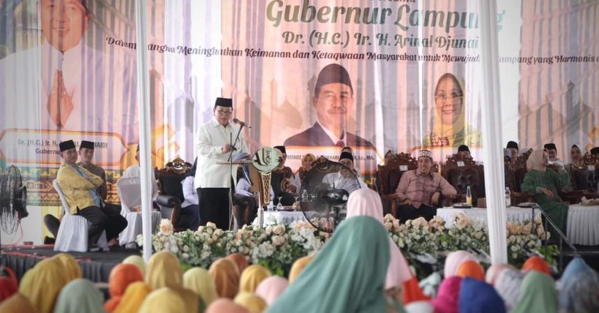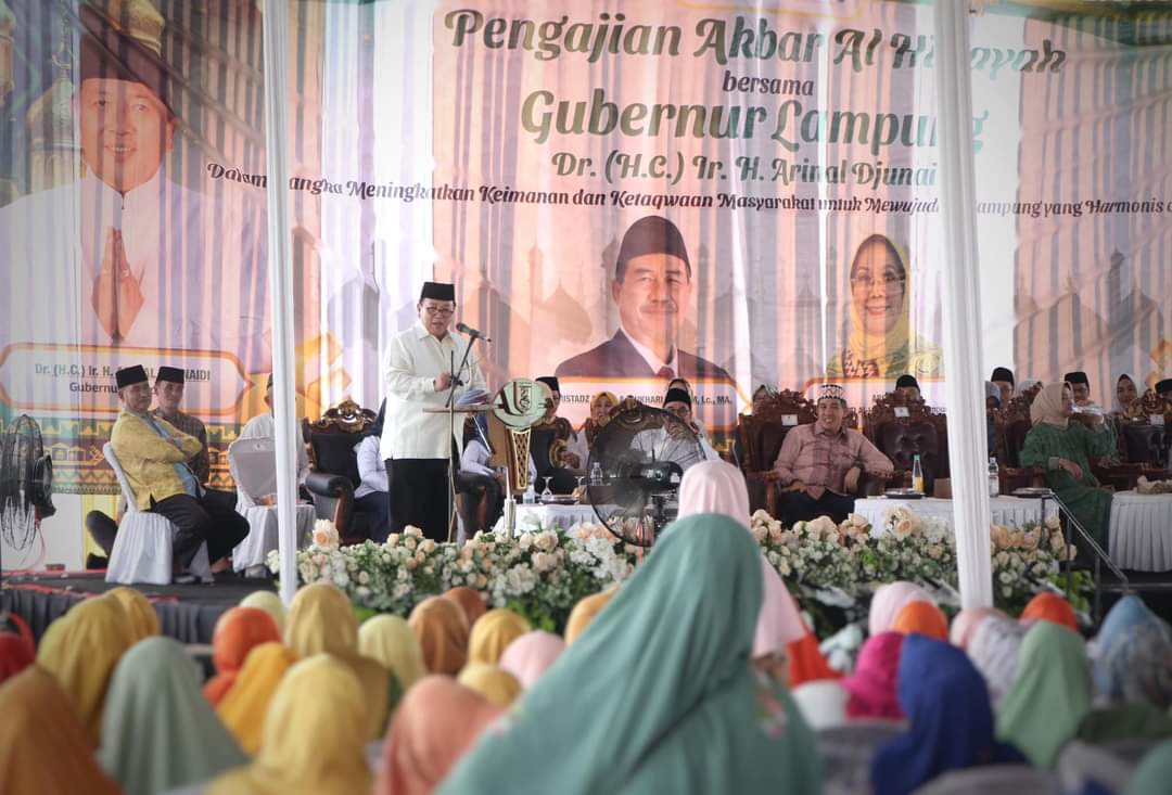 Gubernur Lampung Arinal Djunaidi didampingi oleh Ketua TP PKK Provinsi Lampung Riana Sari Arinal menghadiri Pengajian Akbar yang digelar oleh Pemerintah Provinsi Lampung, di Lapangan Tri Tura Kedondong, Senin (27/05/2024).