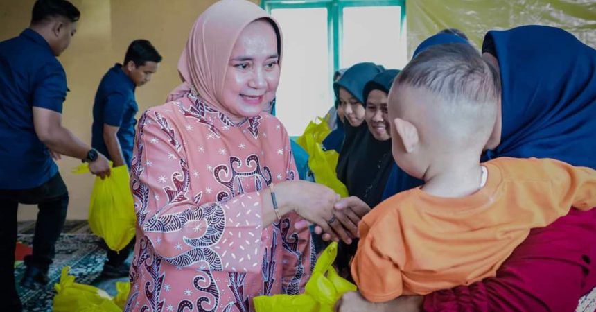 Ketua LKKS Provinsi Lampung, Riana Sari Arinal, membagikan bantuan dari Gubernur Lampung berupa paket sembako kepada warga Pekon Sukabanjar Kecamatan Gunung Alip Tanggamus, Selasa (04/06/2024).