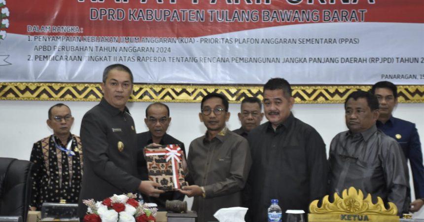 Tulang bawang barat,Catatanlampung.com- Sekretaris Daerah (Sekda) Kabupaten Tulang Bawang Barat (Tubaba) Ir. Novriwan Jaya, S.P., Menghadiri Rapat Paripurna Penyampaian KUA-PPAS APBD-P Tahun Anggaran 2024 dan Pembicaraan Tingkat II atas Raperda RPJPD Tahun 2025-2045. Di Ruang Paripurna DPRD setempat, Senin (15/07/2024)