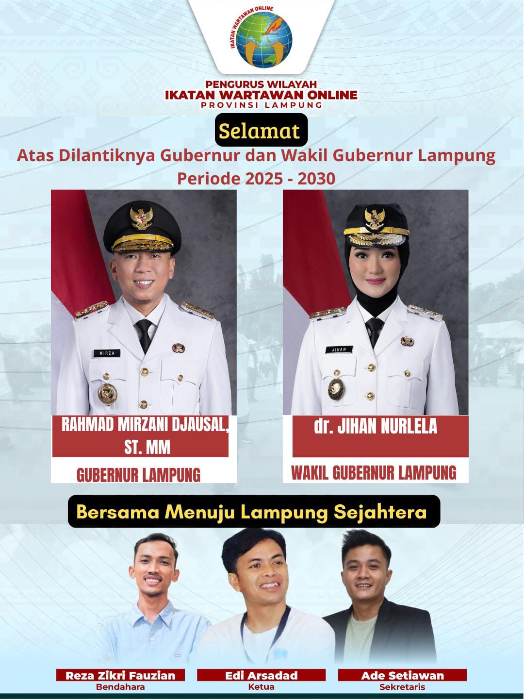Untuk itu Ikatan Wartawan Online (IWO) Provinsi Lampung Mengucapkan syukur telah dilantik nya Gubernur Baru Dan wakil gubernur baru untuk memimpin Lampung lima tahun kedepan.