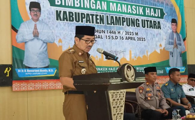 CatatanLampumg, Lampung Utara, Selasa (15/4/2024) – Bupati Lampung Utara, Dr. Ir. Hamartoni Ahadis, M.Si., secara resmi membuka kegiatan Bimbingan Manasik Haji Kabupaten Lampung Utara Tahun 1446 H / 2025 M yang diselenggarakan di Gedung Serba Guna (GSG) Islamic Centre Kotabumi, pada Selasa (15/4/2025).