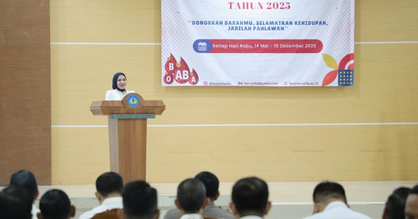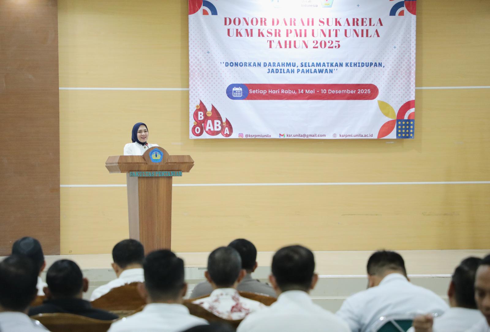 CatatanLampung, Bandar Lampung, Rabu (14/5/2025) – Ketua Palang Merah Indonesia (PMI) Provinsi Lampung, Purnama Wulan Sari Mirza membuka kegiatan Donor Darah Sukarela Unit Kegiatan Mahasiswa (UKM) Korps Sukarela (KSR) PMI Unit Unila Tahun 2025, di Aula Fakultas Pertanian Unila, Rabu (14/5/2025).