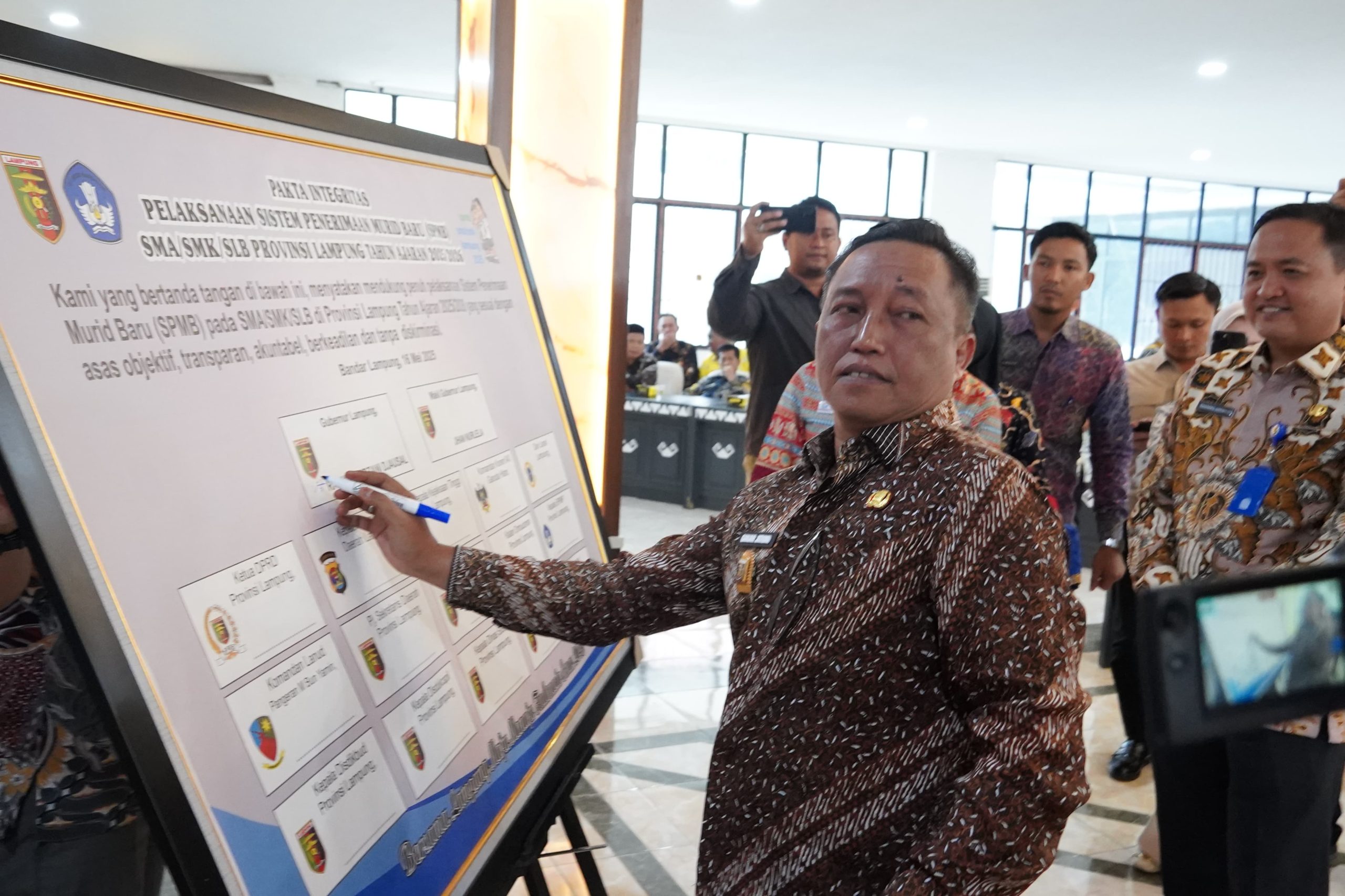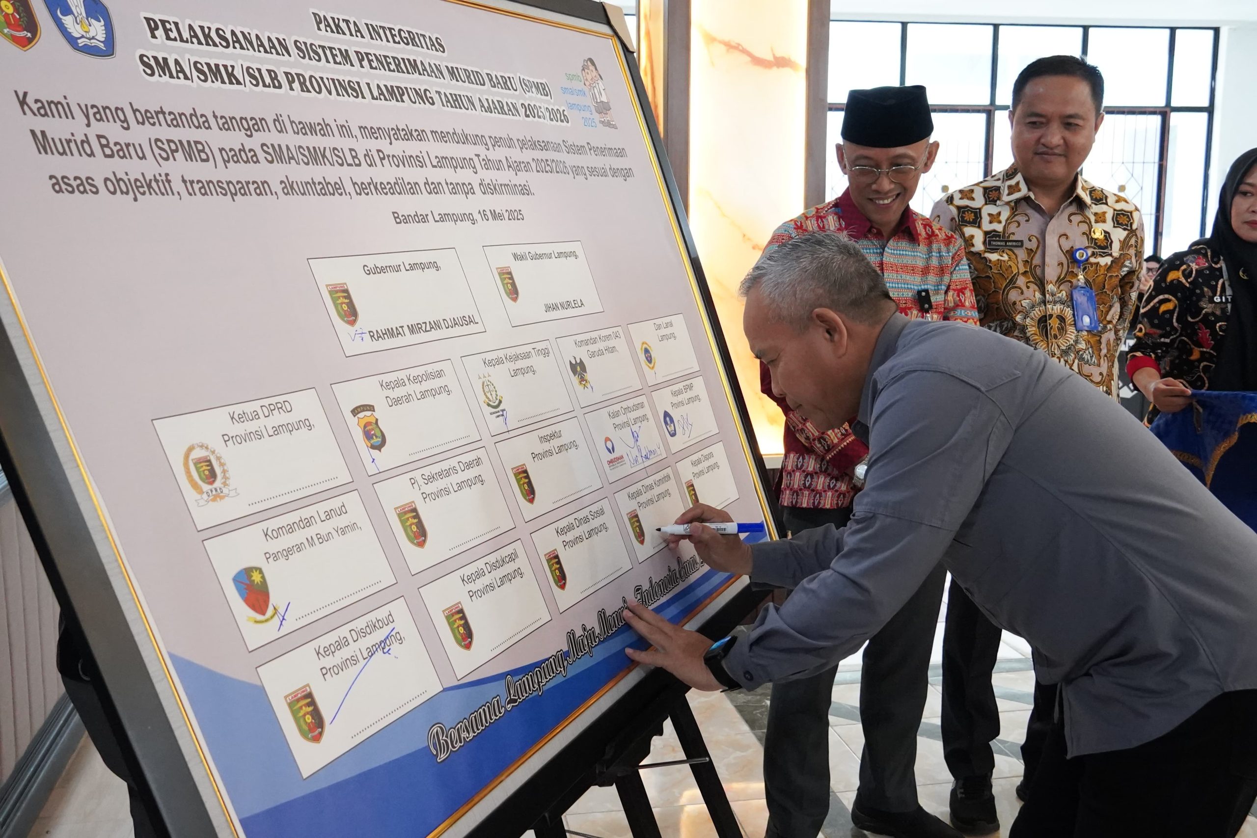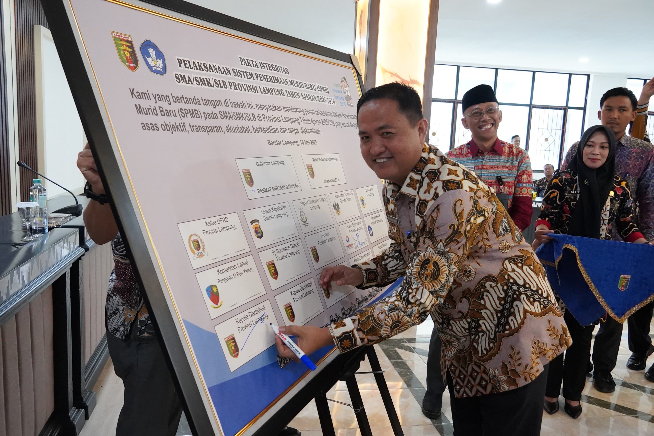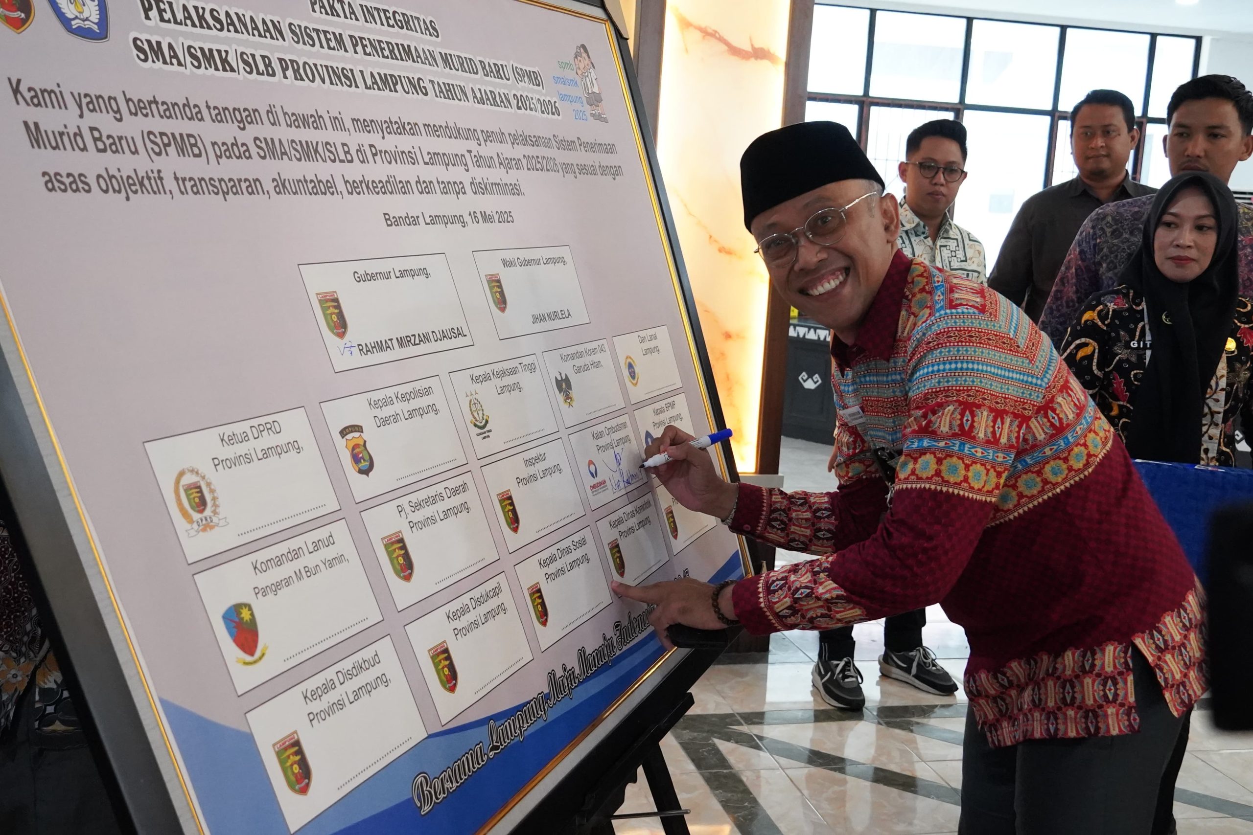 “Dengan dukungan dari semua pihak dan komitmen kita yang diwujudkan dengan penandatanganan pakta integritas, kita berharap pelaksanaan SPMB di Provinsi Lampung Tahun Ajaran 2025/2026 dapat berjalan lancar dan berhasil dalam mewujudkan sistem penerimaan murid baru yang adil, transparan, dan inklusif,” pungkasnya. (Angga).