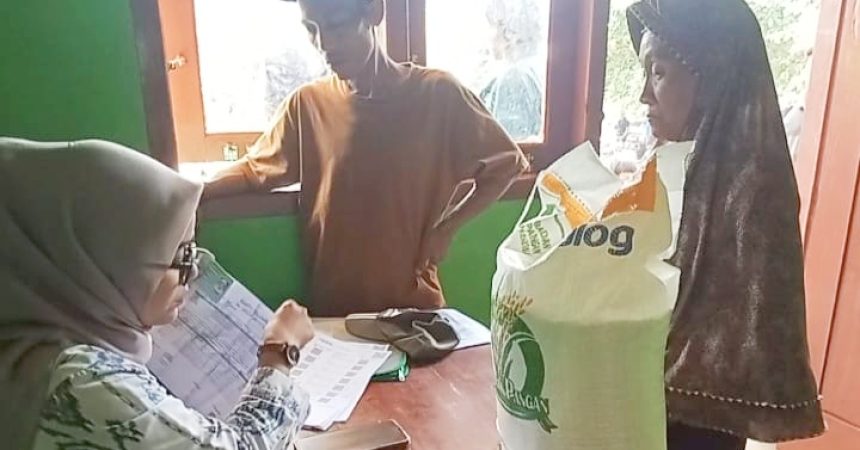 Petugas desa melakukan pencatatan data penerima bantuan saat penyaluran beras di Balai Desa Sumber Tani – (Sumber foto: Andi SM/Cl)