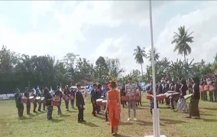 Penampilan pasukan drumband ikut memeriahkan rangkaian upacara peringatan HUT ke-80 Kemerdekaan Republik Indonesia di Lapangan Kecamatan Tanjung Raja, Kabupaten Lampung Utara, Minggu (17/8/2025) – (Sumber foto: Nurliana/Cl)