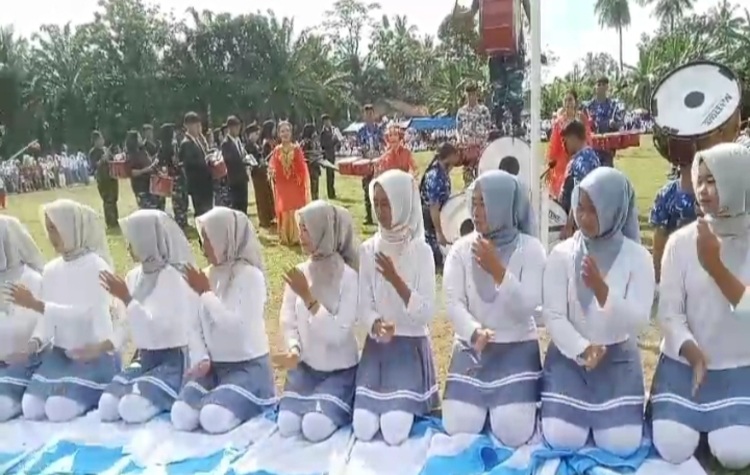 Penampilan seni kreasi siswa putri turut memeriahkan rangkaian acara peringatan HUT ke-80 Kemerdekaan Republik Indonesia di Lapangan Kecamatan Tanjung Raja, Kabupaten Lampung Utara, Minggu (17/8/2025) – (Sumber foto: Nurliana/Cl)