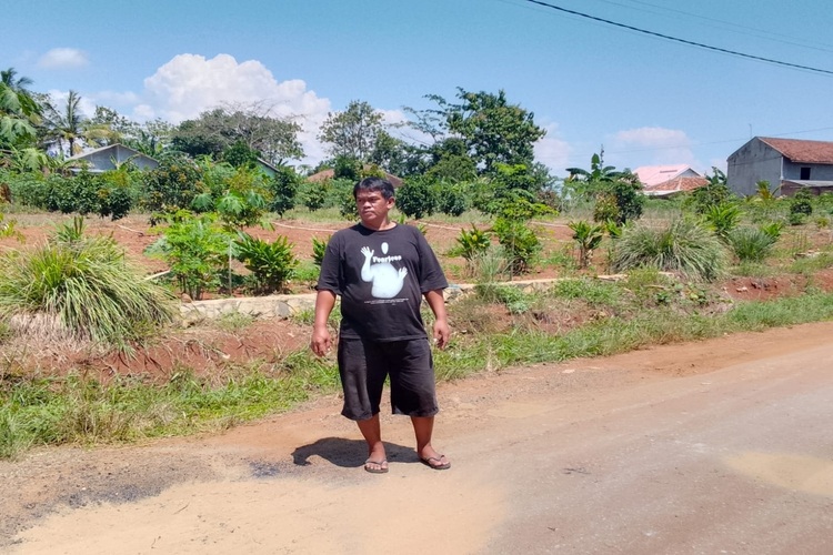 Rusdi Yanto, tokoh masyarakat Kelurahan Rejosari, saat meninjau kondisi ruas Jalan Lebung Curup yang rusak parah dan menjadi akses penting menuju Pondok Pesantren Al-Hiro serta ke arah Wonogiri, pada Minggu (24/8/2025) – (Sumber: Romli Moershaf/Cl).