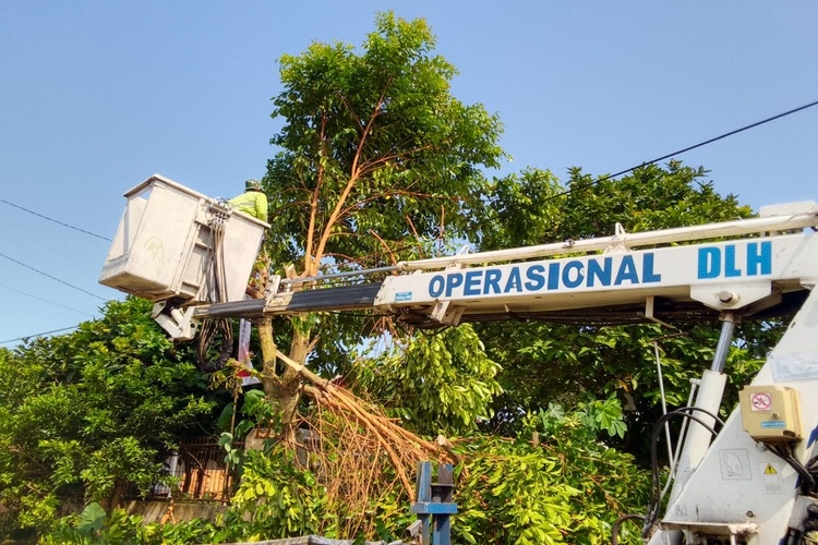 Petugas Dinas Lingkungan Hidup (DLH) Kabupaten Lampung Utara menggunakan mobil operasional saat melakukan pemangkasan pohon kapuk di Kelurahan Rejosari, Selasa (26/8/2025) – (Sumber: Romli Moershaf/Cl).