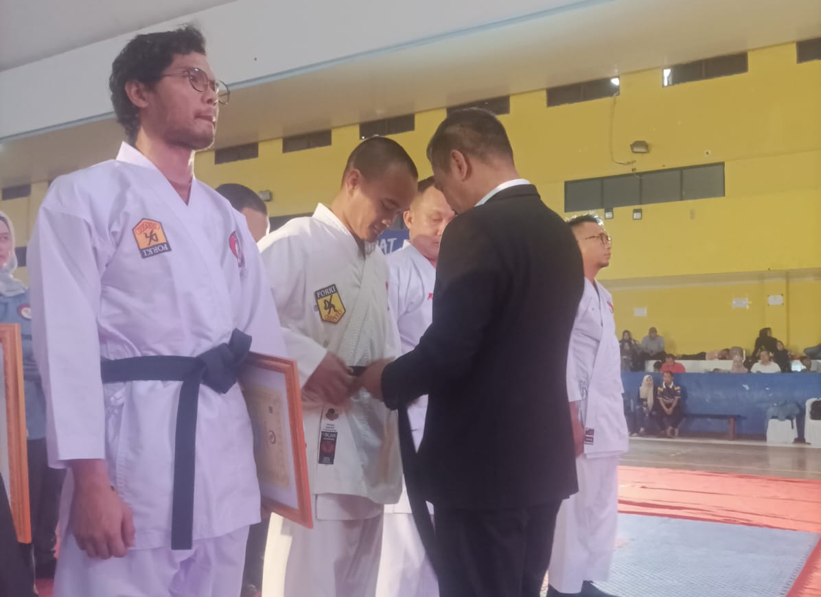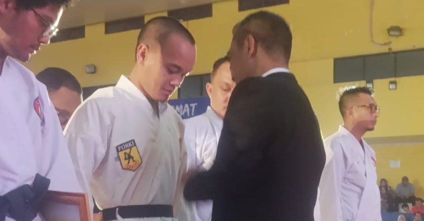 Ketua FORKI Lampung Utara, Rio Septiandri, SH, menerima penyematan DAN II Kehormatan Lemkari dari Ketua Umum PB Lemkari, Mayjen Mar (Purn) Bambang Sutrisno, pada acara di PKOR Way Halim, Bandar Lampung, Sabtu (30/8/2025) – (Sumber foto: Ist/Cl).