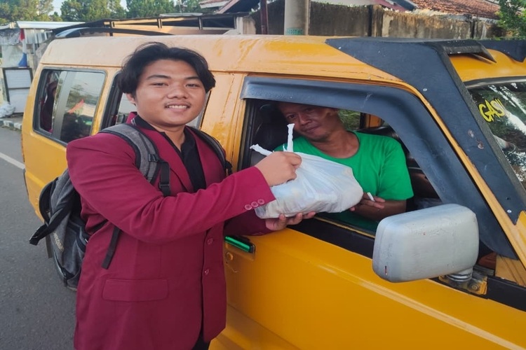 Mahasiswa UMKO saat menyerahkan paket sembako kepada seorang pengemudi angkutan umum yang ditemui pada salah satu jalan seputar Kotabumi Lampung Utara, sebagai wujud kepedulian sosial, pada Selasa (2/9/2025) – (Sumber: Nurliana/Cl).