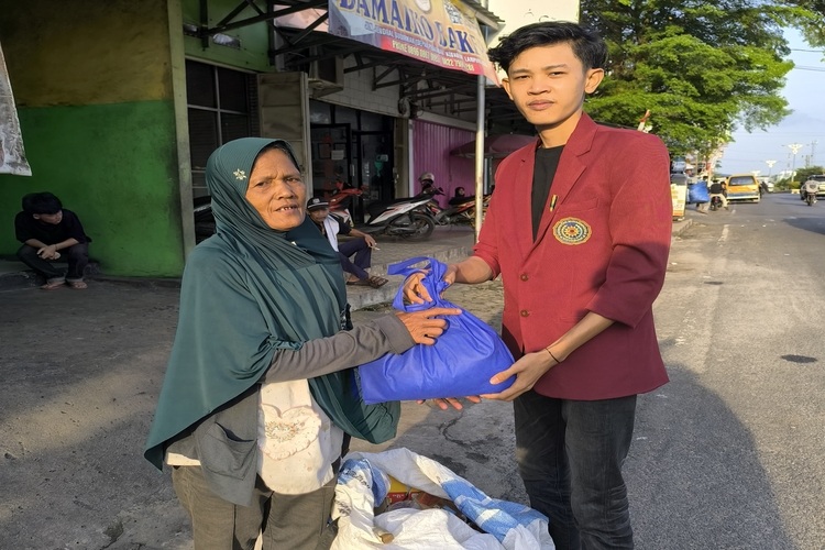 Mahasiswa UMKO saat menyerahkan paket sembako kepada masyarakat kurang mampu yang ditemui pada salah satu jalan seputar Kotabumi Lampung Utara, sebagai wujud kepedulian sosial, pada Selasa (2/9/2025) – (Sumber: Nurliana/Cl).