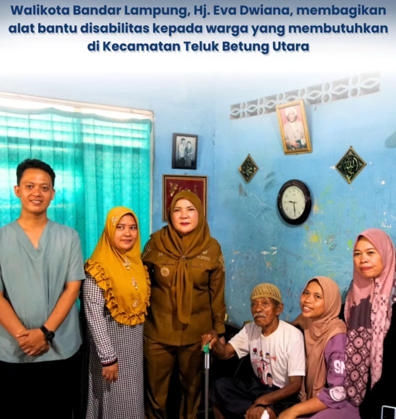 Walikota Bandar Lampung, Hj. Eva Dwiana, membagikan alat bantu disabilitas kepada warga yang membutuhkan di Kecamatan Teluk Betung Utara. Selasa (16/9/2025).