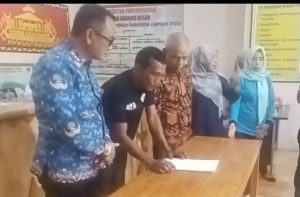 Perwakilan peserta Musrenbangdes Desa Gunung Besar menandatangani berita acara hasil musyawarah penyusunan RKPDes tahun 2026 di kantor desa setempat, Kecamatan Abung Tengah, Lampung Utara, Jumat (17/10/2025). (Sumber foto: Andi SM/Cl).