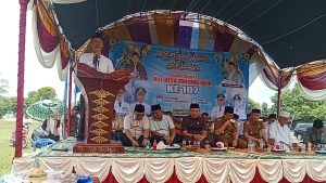 Kepala Desa Tanjung Raja, Yunis, saat menyampaikan sambutan pada peringatan HUT ke-107 Desa Tanjung Raja yang dirangkaikan dengan pengajian akbar, Selasa (21/10/2025). Acara dihadiri Bupati dan Wakil Bupati Lampung Utara, jajaran Forkopimda, anggota DPRD, serta tokoh agama dan masyarakat setempat – (Sumber foto: Nurliana/Cl).
