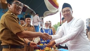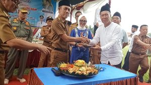 Wakil Bupati Bupati Lampung Utara, Romli, menerima potongan tumpeng dari Kepala Desa Tanjung Raja sebagai simbol rasa syukur dan kebersamaan dalam peringatan HUT ke-107 Desa Tanjung Raja, Selasa (21/10/2025). Acara dihadiri Wakil Bupati, jajaran Forkopimda, anggota DPRD, serta tokoh masyarakat setempat – (Sumber foto: Nurliana/Cl).