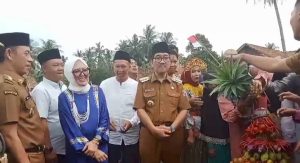 Bupati dan Wakil Bupati Lampung Utara bersama jajaran pejabat daerah menyaksikan kirab hasil bumi yang dibawa masyarakat dalam peringatan HUT ke-107 Desa Tanjung Raja, Selasa (21/10/2025). Kirab tersebut menampilkan berbagai hasil pertanian warga sebagai simbol kemakmuran dan rasa syukur – (Sumber foto: Nurliana/Cl).