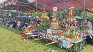 Beragam hasil bumi seperti buah-buahan, sayuran, dan produk olahan warga disusun membentuk gunungan hias pada peringatan HUT ke-107 Desa Tanjung Raja, Selasa (21/10/2025). Tradisi ini menjadi simbol kemakmuran, kreativitas, dan rasa syukur masyarakat atas hasil panen mereka – (Sumber foto: Nurliana/Cl).